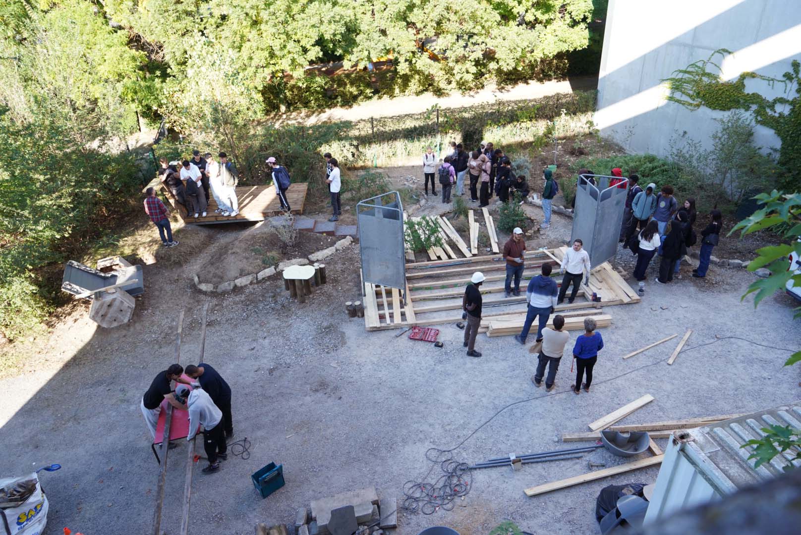 Deux semaines, quarante étudiantes et étudiants issus des filières génie civil et architecture, un défi : bâtir un espace convivial et fonctionnel dans le jardin de l’Institut d’Urbanisme et de Géographie Alpine (IUGA) uniquement avec des matériaux de réemploi. Pari relevé haut la main lors de la 17e édition de l’atelier pédagogique intensif de construction, porté par des enseignants de l’UFR PhITEM et de l’ENSAG – UGA, avec l’appui de la Direction de la Transformation Écologique de l’Université Grenoble Alpes.